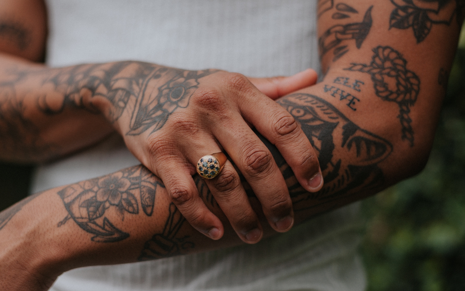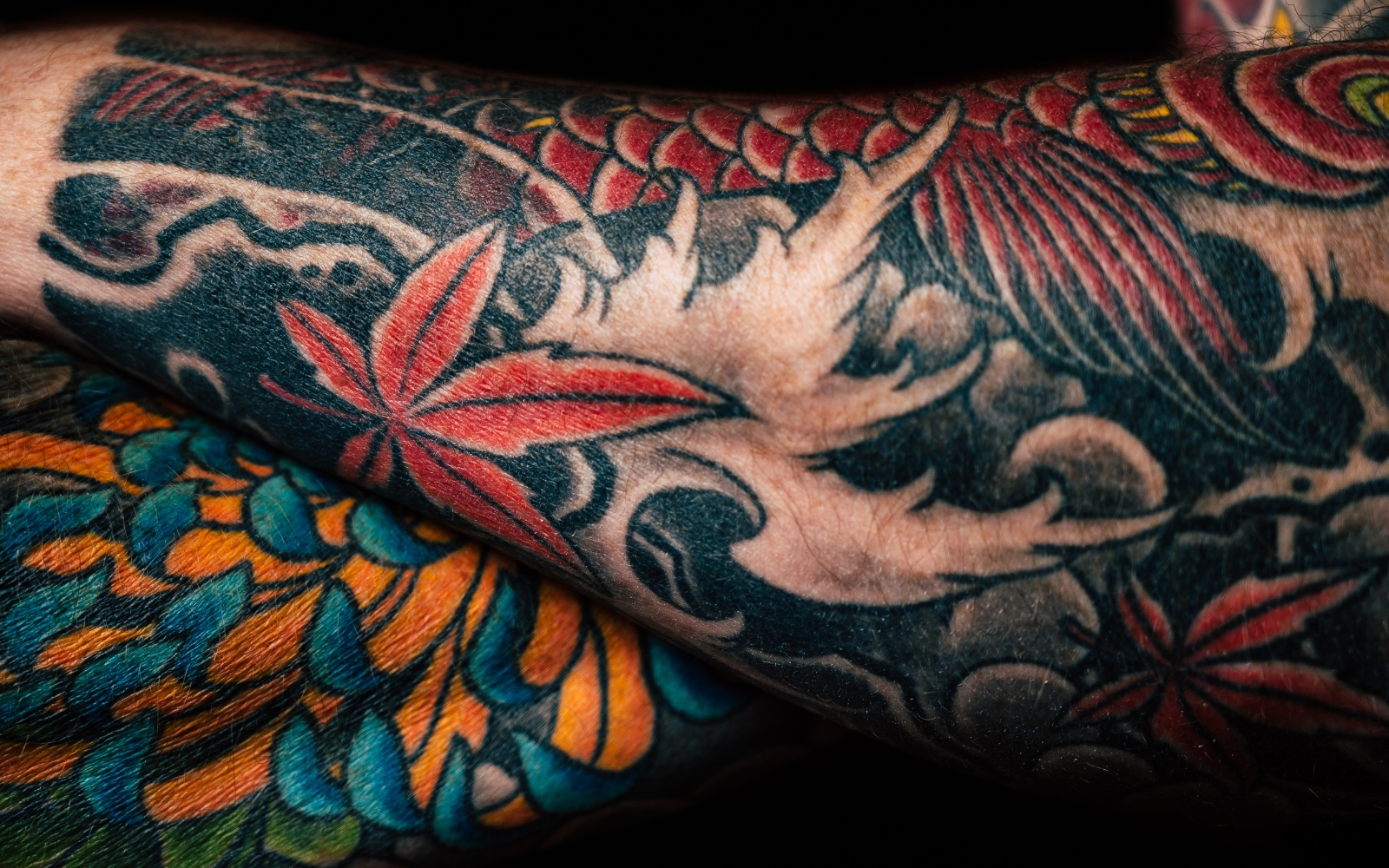 Tatuaż na zdjęciu jest dynamicznym zestawieniem klasycznych motywów tattoo art, gdzie filigranowe cieniowania i boldowe kontury tworzą głębię i teksturę, prezentując roślinne wzory oraz dzikie zwierzęta, w tym dominującego tygrysa, uosabiające siłę i dzikość.